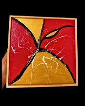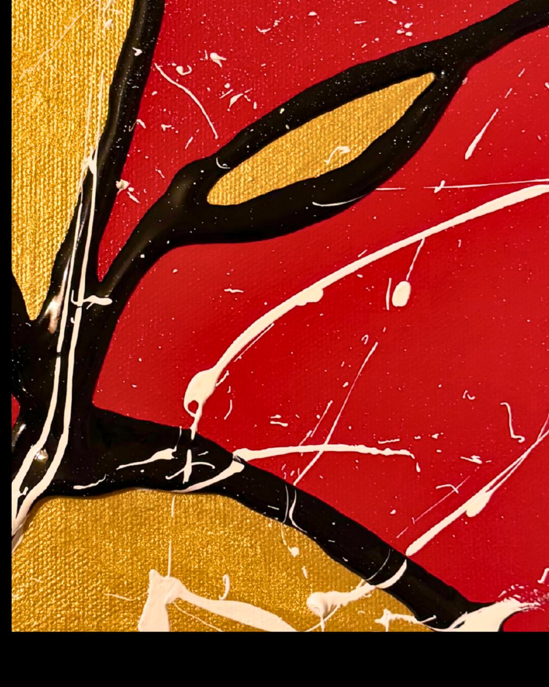 自由な発想と情熱を表現した、赤と金色をテーマにしたアートです。ボンドを使用して立体感と光沢を演出し、凸凹感や輝きが楽しめます。
